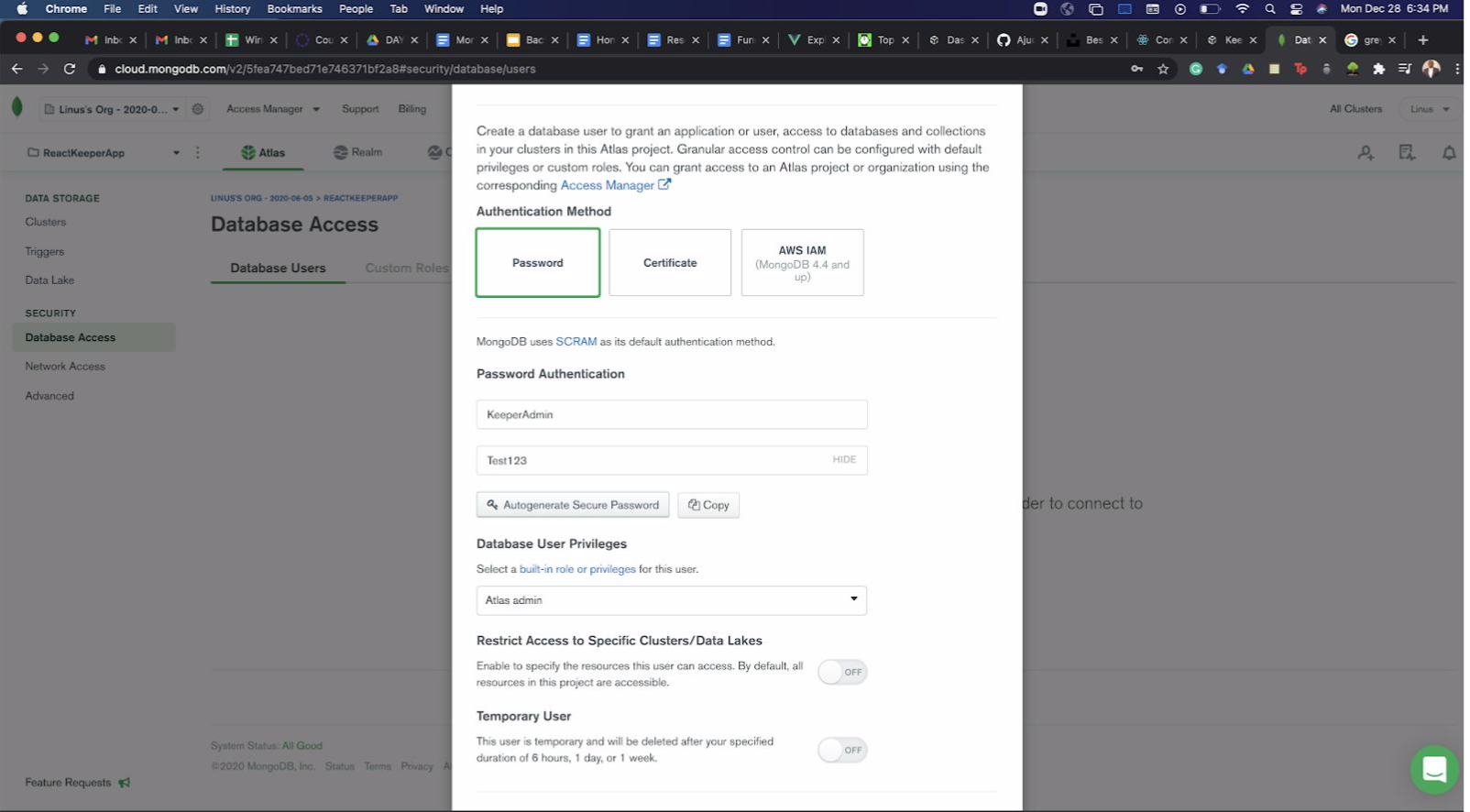 Click on “Database Access” under SECURITY. Then click “Add New Database User”.